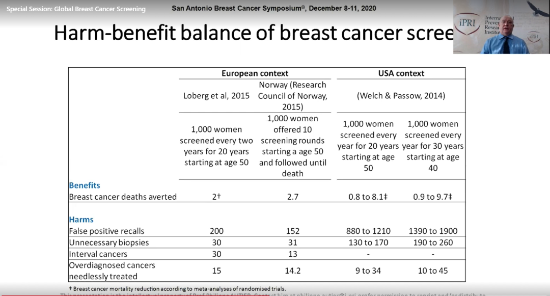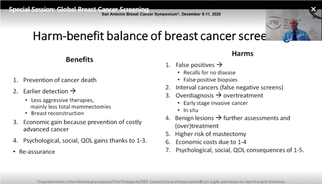 编者按:众所周知,开展乳腺癌筛查可以早期发现患者病灶,减少乳腺癌死亡,减少使用激进疗法并为患者提供乳房再造的能力。避免了疾病晚期而带来经济收益,以及所有与这些相关的心理、社会和生活质量的提高。但是,在SABCS 2020大会上“Global Breast Cancer Screening”特别专场上,Philippe Autier博士带来了“权衡乳腺癌筛查的利弊”的讲课,提醒临床医生需要考虑一些潜在的弊端。