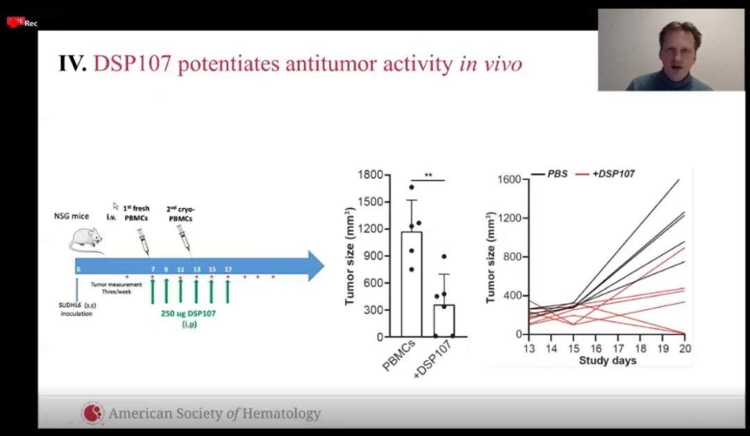 ④将经过DSP107治疗的SUDHL6细胞系和外周血单核细胞(PBMCs)共同注射至小鼠体内,结果显示,较之于仅注射PBMCs的小鼠而言,其小鼠的肿瘤组织体积明显缩小。