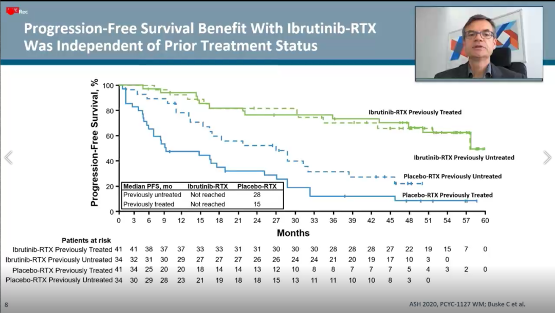 ①在无进展生存(PFS)方面,伊布替尼+利妥昔单抗(IR)方案组的中位PFS尚未达到(NR),安慰剂+利妥昔单抗组的中位PFS为20.3月(HR=0.25,95%CI:0.15~0.42; p<0.0001)。在第54个月时的PFS分别为68%(IR)vs 25%(安慰剂+R)。