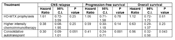 ④有35例患者接受高强度免疫化疗、68例患者接受自体干细胞移植巩固治疗,结果表明其CNS的复发率要低于接受传统R-CHOP方案的DLBCL患者,分别为6% vs 14%。⑤通过多因素分析发现,接受HD-MTX和高强度免疫化疗与CNS复发风险、PFS及OS无显著的相关性;而接受自体干细胞移植巩固治疗则可降低降低CNS的复发风险(HR=0.30, 95% CI:0.09~1.01)、提升PFS(HR=0.41, 95% CI:0.24~0.71)和OS(HR=0.56, 95% CI:0.32~0.98),详见下表2。