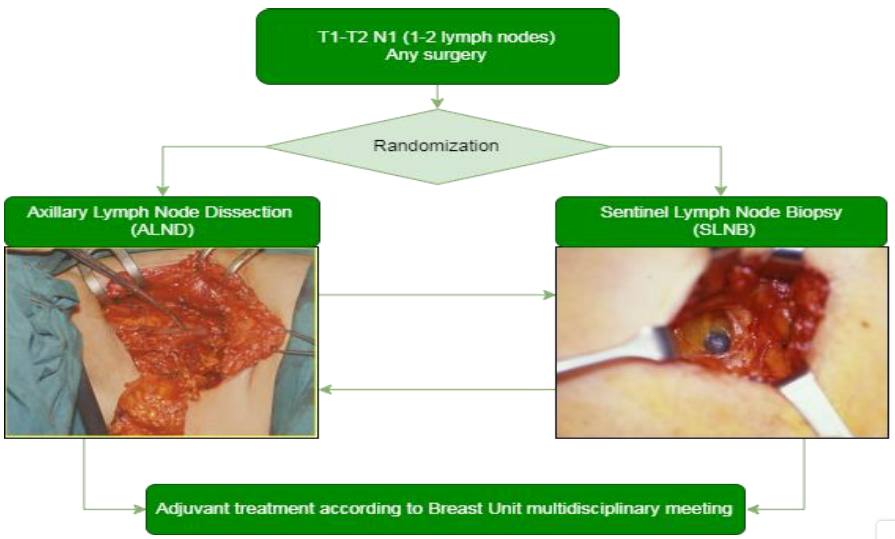 入组标准:患者年龄:40-75岁;肿瘤为原发性侵袭性癌,大小T1-T2肿瘤;腋窝淋巴结临床评估为N0;不超过2枚SLN宏转移;无远处转移;未行新辅助治疗;无既往侵袭性乳腺癌史;患者签署知情同意书。