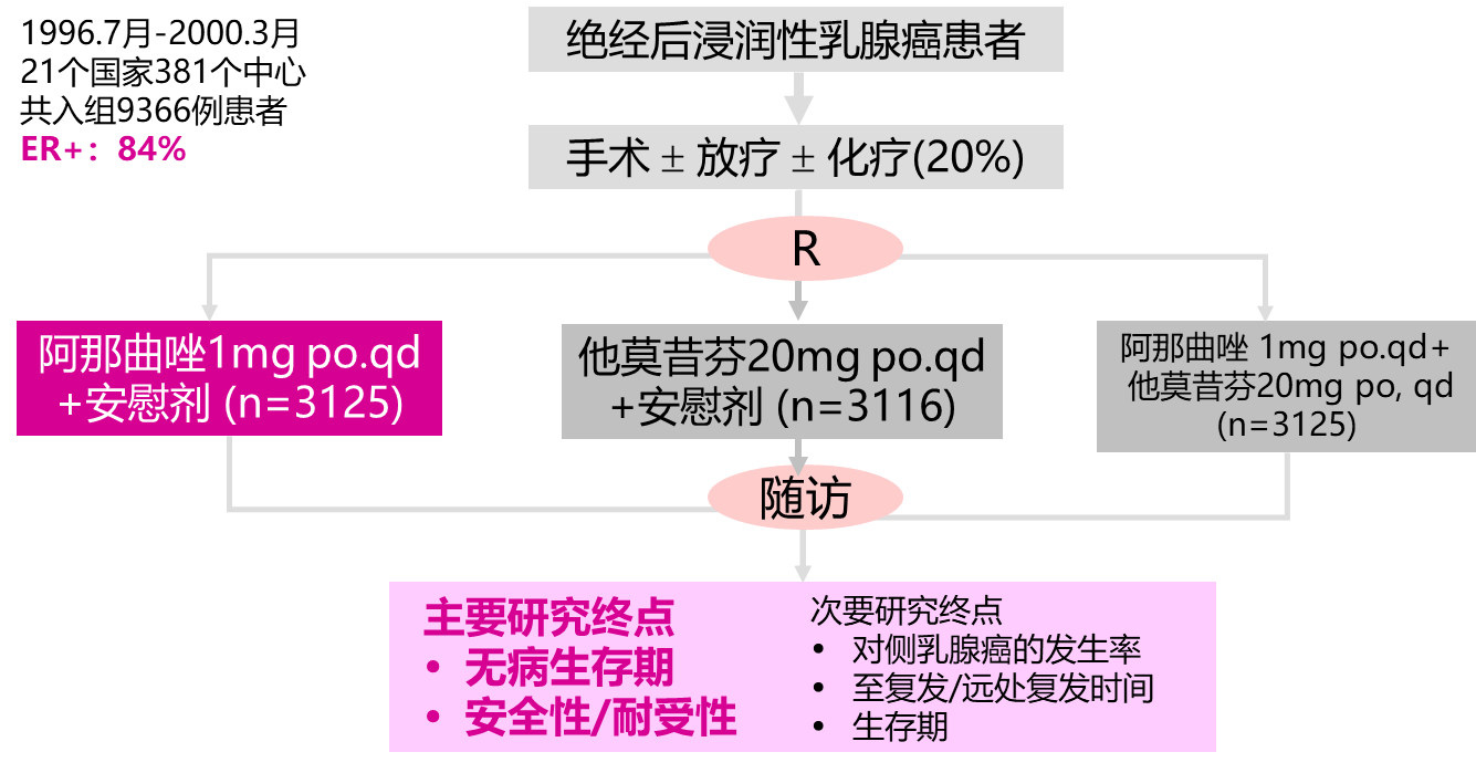研究比较了第3代AI阿那曲唑与他莫昔芬作为HR+绝经后早期乳腺癌初始5年内分泌治疗用药的疗效及安全性。这两种药物作为绝经后且患有早期乳腺癌妇女的辅助治疗,均每日口服给药,持续5年,阿那曲唑每日1mg,他莫昔芬每日20mg。