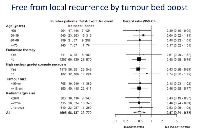 2007年6月至2014年6月,1608例患者被随机分为无局部加量组(805例)和局部加量组(803例)。831例患者接受常规WBI治疗(416例无加量;415名患者加量)。777例患者给予大分割放疗(389例患者无加量,388例患者加量)。无加量组106例(13%)和加量组105例(13%)采用辅助内分泌治疗。平均随访时间为6.6年。无加量组5年无局部复发率为93%,加量组为97%(HR=0.47,95%CI:0.31~0.72,P<0.001)。瘤床加量组的获益与年龄、肿瘤大小、核分级、手术切缘、内分泌治疗与否均无相关性。全乳放疗常规分割与大分割,在五年无局部复发率上没有显著差异(95% vs .95%,P=0.89)。两组之间2级以上的乳房疼痛、皮肤及皮下纤维化大致相仿。