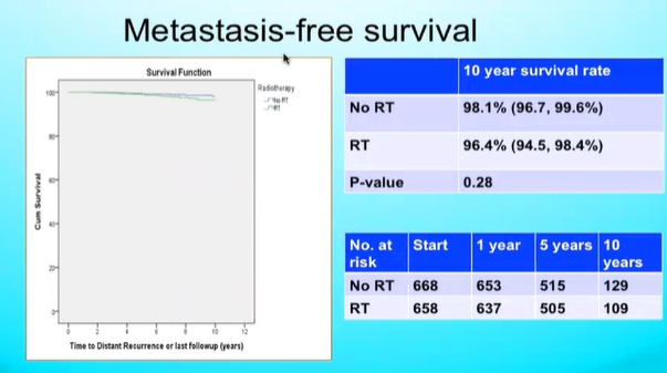 658名接受保乳手术并接受辅助内分泌治疗的患者被随机分配接受全乳照射,另有668名妇女不接受放疗。在中位随访10年后,同侧乳腺肿瘤复发率,未接受放疗和放疗组分别为9.8% vs 0.9%(P=0.0008),但对10年总生存和无转移相关生存无明显影响(80.4% vs 81%,98.1% vs 96.4%),ER高表达组现对于ER低表达组10年局控失败率分别9.8% vs 18.8%(P=0.007),放疗组和非放疗组因乳腺癌的死亡率分别为9%和4%。