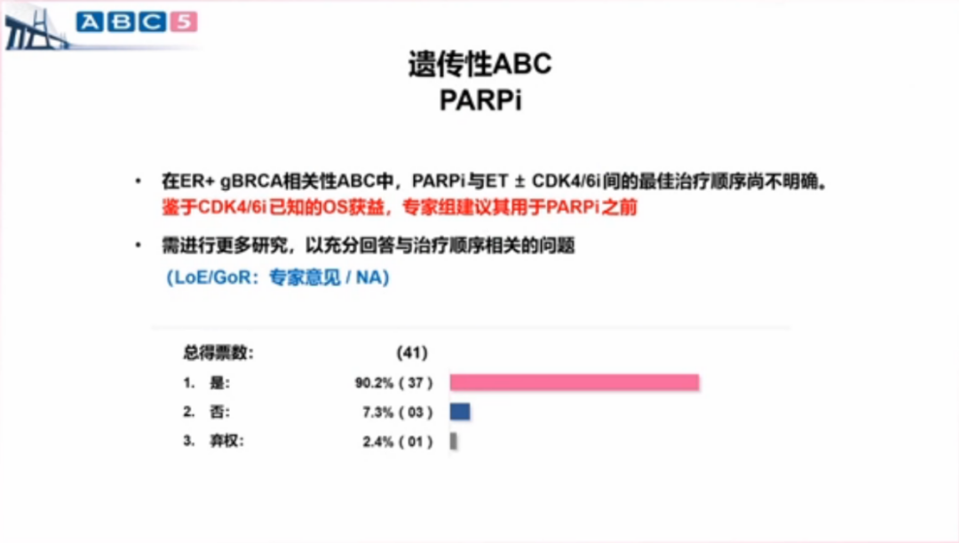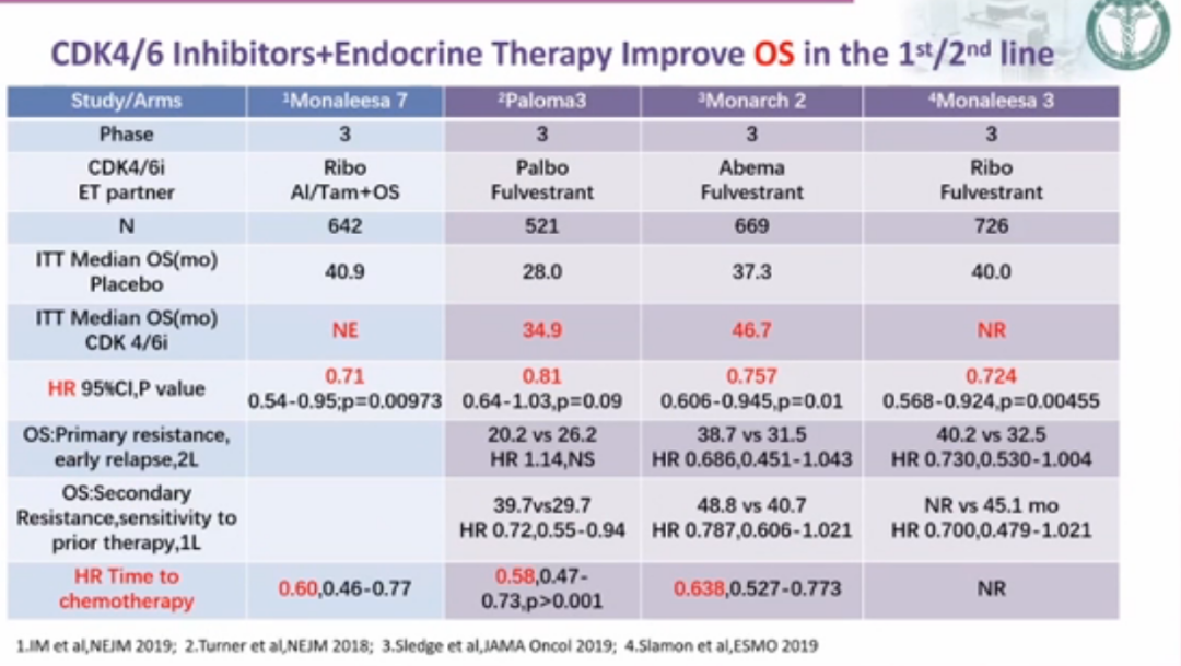 其次,乳腺癌领域重要的治疗指南与专家共识也给予了一致的观点。ABC5明确指出目前尚不能确定gBRCA突变的HR+晚期乳腺癌患者PARP抑制剂和CDK4/6抑制剂联合内分泌治疗的最佳顺序,但是鉴于CDK4/6抑制剂已知的OS获益,90.2%的专家组成员建议其用于PARP抑制剂之前。2020年NCCN指南和CSCO指南在HR+晚期乳腺癌内分泌治疗适应症中,均一致推荐,不存在内脏危象的HR+/HER2-晚期乳腺癌,均可接受靶向联合内分泌治疗。CDK4/6抑制剂靶向治疗扩展和巩固了内分泌治疗的优选地位。