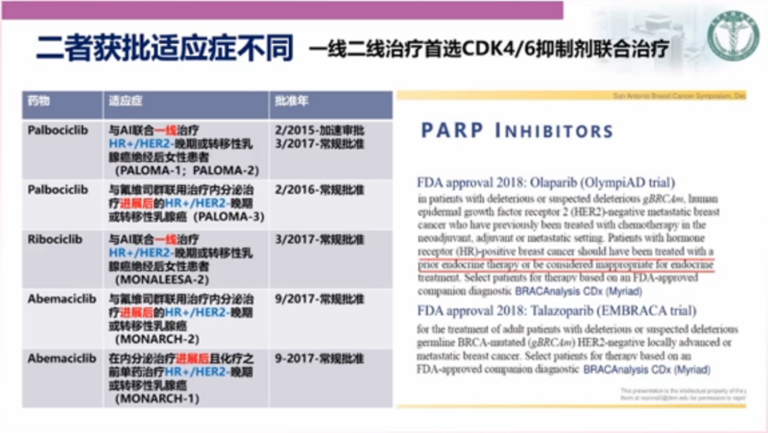 BRCA1/2突变HR+HER2-晚期乳腺癌是有独立特征的较少比例人群,CDK4/6抑制剂和PARP抑制剂都是可选择的靶向治疗药物。但是,二者是在不同人群特征中开展的临床研究,尽管人群会有交叉,但治疗线次不同,对比治疗手段不同,获得结果不同,获批适应症也不同,更没有二者头对头的对比研究。从临床研究的间接对比可以知道,多项研究已经证实CDK4/6抑制剂联合内分泌治疗在HR+/HER2-晚期乳腺癌一线和二线治疗中的卓越结果,不仅获得主要研究终点PFS的显著获益,同时还获得了多项研究中总生存的获益,奠定了CDK4/6抑制剂联合内分泌治疗在HR+/HER2-晚期乳腺癌的优选地位,以及获批相应适应症。