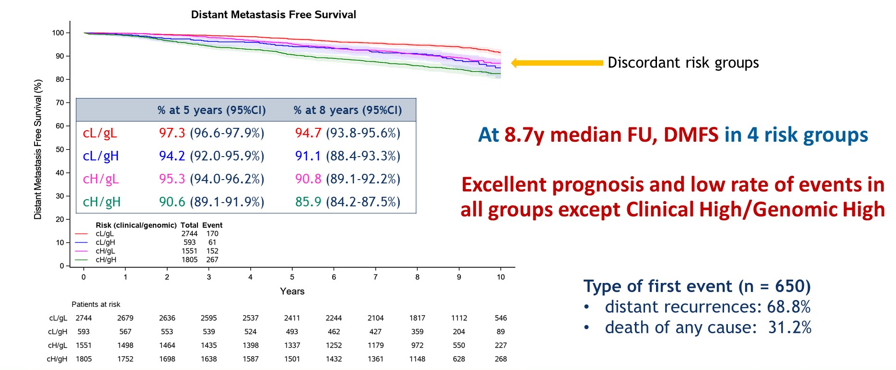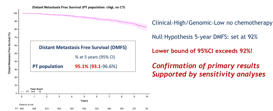 研究结果:中位随访时间为8.7年,更新了临床高风险/基因组低风险的初次试验人群的5年DMFS率(无辅助化疗组 95.1%(95%CI 93.1-96.6))。