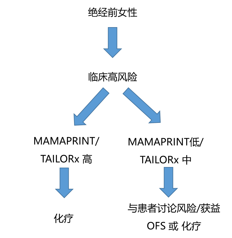 3. 对于年龄≤50岁的绝经前女性,接受化疗相较于未接受化疗其8年无远处转移生存率提高了5%。而在TAILORx研究中,RS为11-25的中危复发风险且年龄≤50岁临床高风险的绝经前女性,接受化疗相较于未接受化疗其9年的远处复发风险可降低6%。而在年龄>50岁的女性中,无论是在MINDACT或在TAILORx研究中,我们并没有观察到化疗所带来这么显著的获益。这种效应可能与化疗引起的卵巢功能抑制所带来的获益。可选择以下路径。