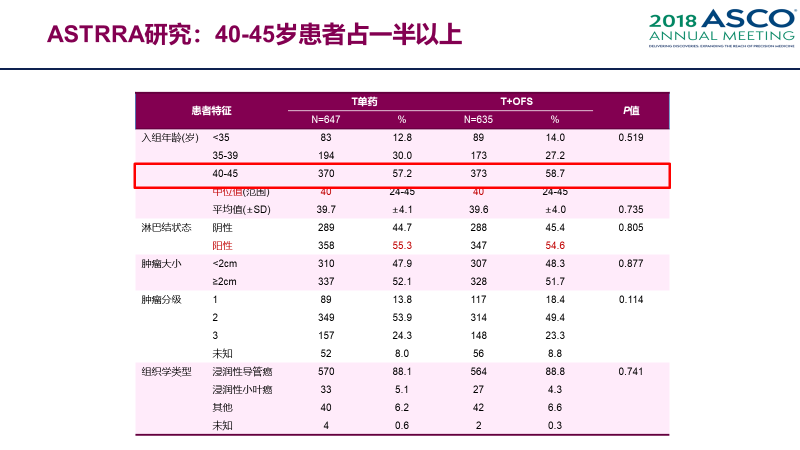 SOFT和TEXT研究入组了约30%的40-45岁人群,发现 45-50岁亚组卵巢抑制联合芳香化酶抑制剂*对比单独的他莫昔芬,8年DFS 92.4% vs 85.0%,可以看到7.4%的绝对获益,这是非常大的一个获益。虽然这部分患者卵巢功能已经衰退,卵巢抑制本身虽然还是有获益,但单独获益还是有限(86.8% vs 85.0%,绝对获益1.8%),但因为卵巢抑制可以确保患者变为绝经后状态,这时可以放心联合芳香化酶抑制剂,享受了芳香化酶抑制剂治疗相比他莫昔芬的DFS获益。所以对于40-45岁人群,虽然卵巢功能已经衰退,依然可能从卵巢抑制中获益,中高危患者有必要进行卵巢抑制联合芳香化酶抑制剂治疗。