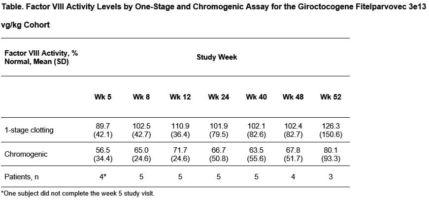 Alta研究是一项i/ii期剂量范围探索、单次给药研究,giroctocogene fitelparvovec是一种编码改良F8基因的重组AAV血清型6(rAAV6)载体。纳入的患者为≥18岁的重度A型血友病成人患者。将Giroctocogene fitelparvovec以4个递增剂量(9e11、2e12、1e13和3e13 vg/kg)输注至4个队列的患者中,每个队列2例患者。将3e13 vg/kg剂量队列扩展至另外3例患者。关键终点包括安全性、循环FVIII活性、FVIII替代治疗的使用和出血事件的频率。