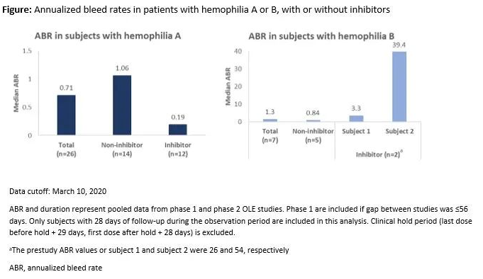 34例患者(A型血友病患者,n=27[13例有抑制物,14例无抑制物];B型血友病患者,n = 7[2例有抑制物,5例无抑制物])入组ii期开放性扩展研究,接受治疗达4.7年,中位暴露时间约为2.6年(截至2020年3月10日)。fitusiran预防治疗每月一次皮下给药可在持续期间降低所有患者的抗凝血酶水平(较基线降低85%-72%)。出血事件的探索性分析显示,观察期间的总体中位年出血率为0.84(见图)。根据修订后的出血管理指南(减少旁路制剂的剂量和替代因素),成功管理了突破性出血。截至2020年3月10日,fitusiran通常耐受良好,未检测到抗药抗体形成。
