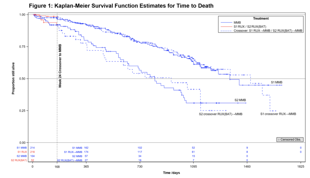 摘要号:54对来自550名接受JAKi初治和先前接受JAKi治疗的MF患者在RT和/或ET中接受Momelotinib的数据进行的进一步分析表明,该药物具有稳定的长期生存,持续的疗效和给药的持久性,与MMB的差异药理学特征相符。 这些数据表明MMB可以持久地解决中/高风险MF患者未满足的需求,延长生存。