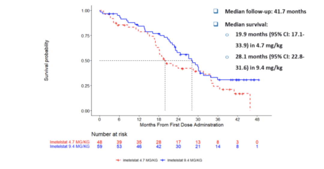 摘要 53 数据显示,在接受JAKi治疗的患者中,使用imetelstat治疗,OS获得了剂量相关的改善。 本研究与其他临床获益相关的研究支持了imetelstat观察到的潜在生存获益,并值得进一步进行临床研究。