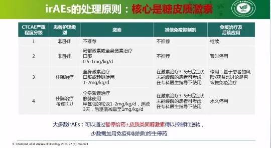 第二,使用糖皮质激素治疗irAE,应早期足量,缓慢减量!毫无疑问糖皮质激素是治疗irAE的核心。糖皮质激素的使用强调几个原则:早期足量,缓慢减量!早期足量就是要给够量,当病人的症状缓解以后,不要太急着去减量,通常情况下以“周”为减量单位。