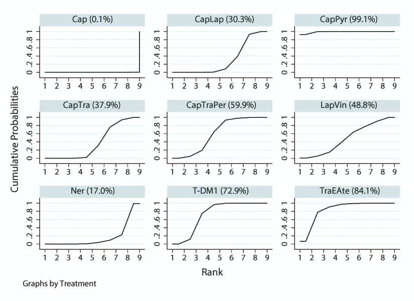 可能有人会说,你这个分析也并没有包括所有可及的方案呀,比如图卡替尼和DS-8201也没包含在分析中。在这里也顺便解释一下,为了保证meta分析的质量,我们此次纳入的研究必须是随机对照研究(RCT)且要求是晚期治疗线数不超过2线,图卡替尼和DS-8201不符合纳入标准,所以没有被纳入。