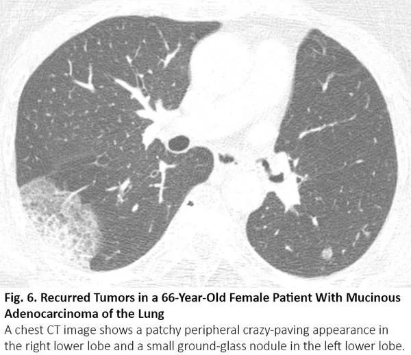 图6. 一位66岁粘液性肺腺癌患者肿瘤复发后的胸部CT