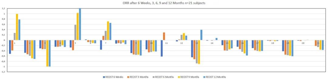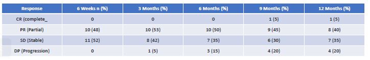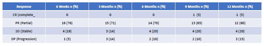 图1联合PRRT + CAPTEM治疗后6周、3个月、6个月、9个月和12个月不同时间点的ORR