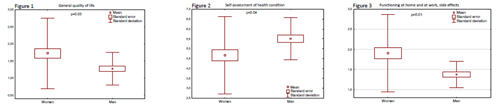 研究结果显示:21名患者,年龄40 - 78岁(59.3 ±11.5岁),13例患者(62%)为女性,8例患者(38%)为男性。如表1所示,尽管调查对象在随访期间QoL存在差异,但在统计学上差异不显著p>0.05。性别之间的统计关系:一般生活质量:女性-1.72 (± 0.51),男性1.28 (± 0.24),p=0.03。自我评估的健康状况因素,女性-4.67 (± 0.98),男性-5.50 (± 0.53) ,p=0.04。在家和工作时的功能状态女性-1.90(± 0.48), 男性-1.38 (± 0.16), p=0.01,见图1、2、3。结论表明,在随访期,即平均8 - 9个月治疗和接下来的9个月观察期,在一般生活质量、自我评估健康状态、在家和工作时的功能状态,不同性别间有显著性差异。已开展的研究未发现新的安全性信号或生活质量恶化。