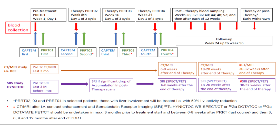 PRRT联合化疗(CAPTEM)是一种在进展性、晚期、不可切除GEP-NET中相对创新的治疗方法。组织病理学证实的pNET(n = 14)和中肠NET (n = 7)患者中进行的前瞻性、单臂、开放标签、2期研究,旨在评估PRRT联合CAPTEM治疗,在治疗期间和治疗后的安全性。表1为患者基线特征。患者以8 - 12周间隔接受3 - 4个周期的177Lu-DOTATOC联合CAPTEM(图1),在整个治疗期间和治疗后临床随访期间(至少12个月),评估了与联合治疗相关的不良事件(AE)和安全性。使用NCI-CTCAE第5.0版对AE进行分级。