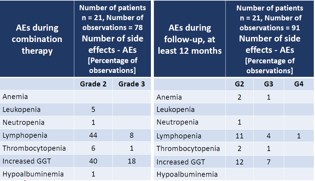 研究结果为:1)治疗相关的AE主要是一过性血液学抑制。在治疗期间最常见的AE为淋巴细胞减少, 2级的淋巴细胞减少占44%,3级的占8%。血小板减少发生率为总患者的7%;2)1位患者由于AE提前中止治疗,其余3例患者由于初始PS=2而治疗期间没有改善提前中止治疗。研究总结,大多数患者可耐受该联合治疗,仅有少部分3级和4级AE出现,主要是治疗期间出现一过性淋巴细胞减少,常在PRRT治疗后第一周出现。