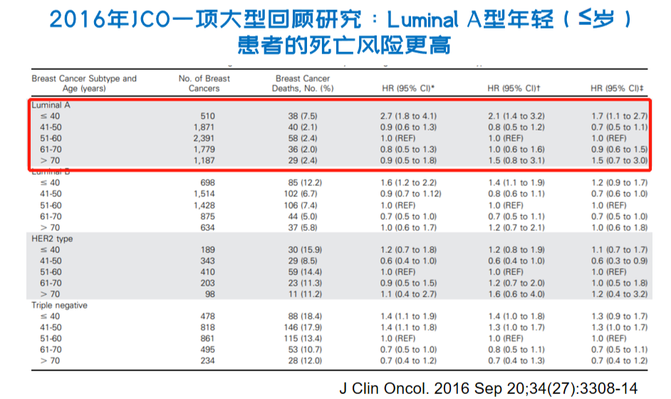 林颖教授:我跟袁教授的观点有一点不同。个人认为年轻只是一个表象,年轻乳腺癌患者预后相对较差的原因非常多。首先,数据证实年轻人中HER2阳性和三阴性的比例较高。另外,年轻人的预期寿命更长,对治疗效果要求更高。第三,在2016年的在JCO上有一篇文章,对不同年龄段不同亚型患者的分析显示年轻患者LuminalA型的比例会相对少,另外在调整包括分期分级、诊断年份、种族因素、教育程度、医疗保险等诸多因素之后,三阴型或者HER2阳性的年轻患者跟年龄大的预后差别不会很明显。预后差距比较大的是在Luminal A型,Luminal A型年轻人的预后,是要明显差于非年轻的患者,应该是因为以往对年轻乳腺癌病人的内分泌治疗相对不足。对于这部分病人需要从时间长度或治疗强度上进行强化,才有可能会逆转年轻患者预后不良的情况。
