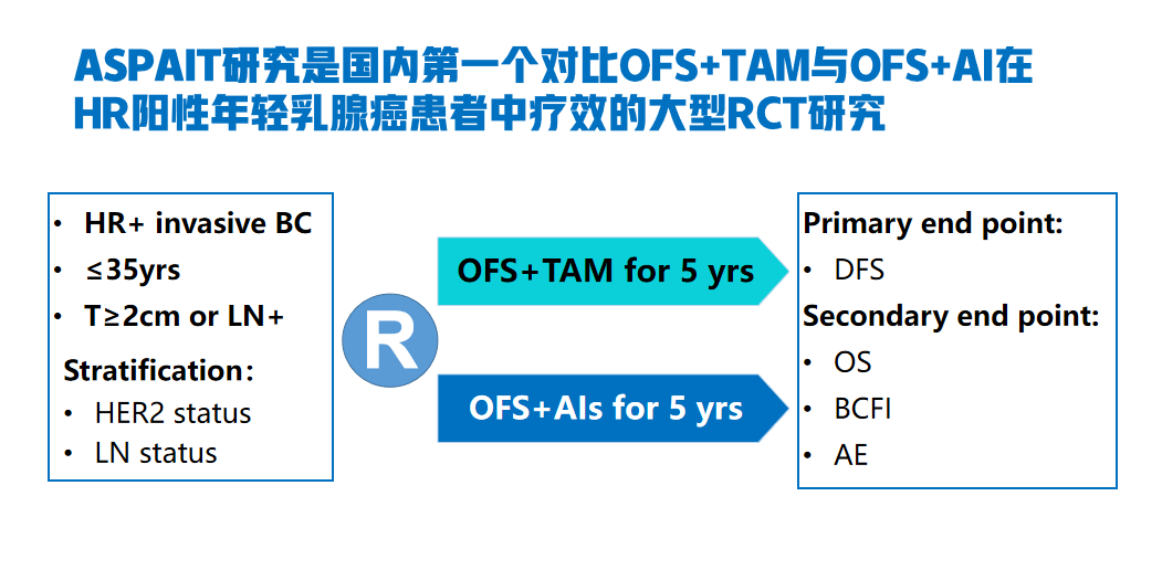 现在我们牵头的一个针对中国年轻年轻乳腺癌人群的全国多中心研究,研究年轻的患者使用OFS+AI还是OFS+TAM,很期待能够其最终的数据会不会跟SOFT和TEXT研究是一致的。去年的圣安东尼奥会议上,我们展出了介绍该研究的壁报。