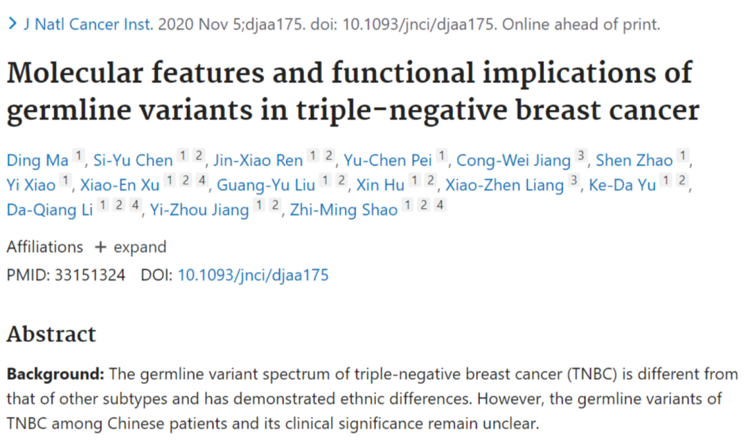 复旦团队联合中国科学院上海巴斯德研究所利用复旦大学附属肿瘤医院325例TNBC全部基因测序数据完成的成果,在2020年《Journal of the National Cancer Institute》发表,探讨了中国TNBC胚系基因变异的分子特征及其临床意义,在实现TNBC精准治疗的道路上又前进了坚实的一步。