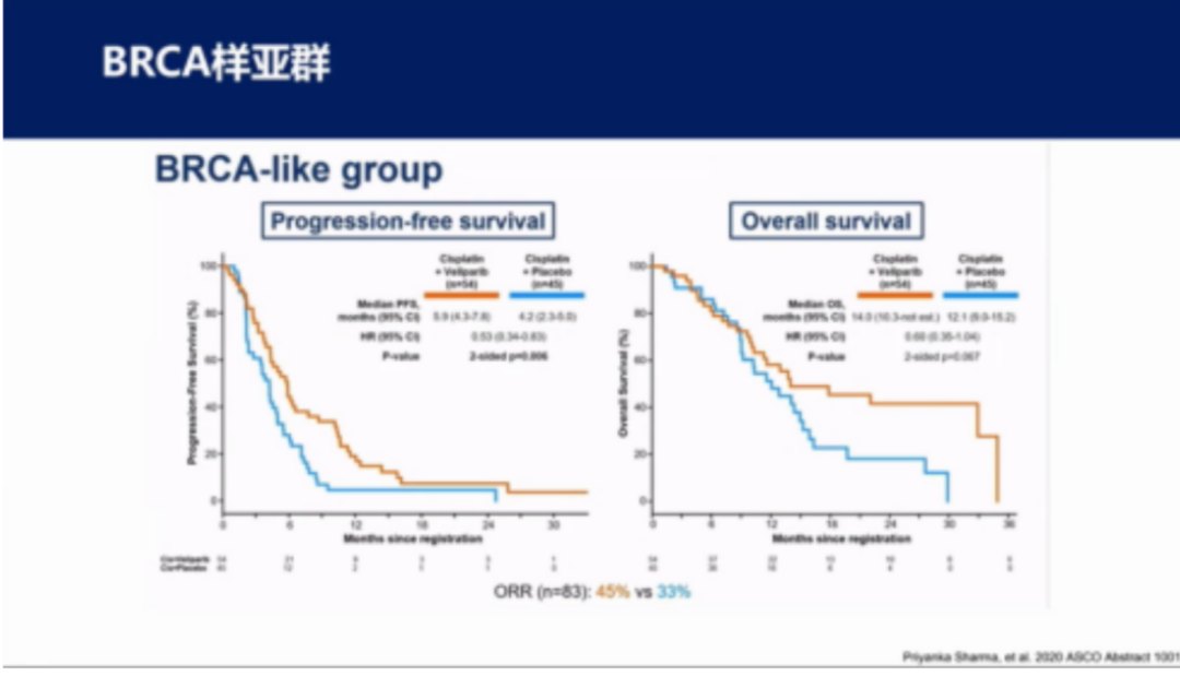 此前未见评价PARP抑制剂联合铂类治疗BRCA野生型TNBC的疗效的研究。2020年ASCO会议报道的SWOG S1416研究比较了gBRCA突变、BRCA样表型和非BRCA样表型3组转移性乳腺癌使用顺铂联合PARP抑制剂维拉帕利(veliparib)对比顺铂联合安慰剂的疗效,探索了veliparib对mTNBC靶向治疗的可行性。研究显示顺铂+ veliparib显著提高BRCA样表型mTNBC的PFS,OS有进一步改善趋势,提示顺铂联合veliparib或可成为此类患者新的治疗选择。