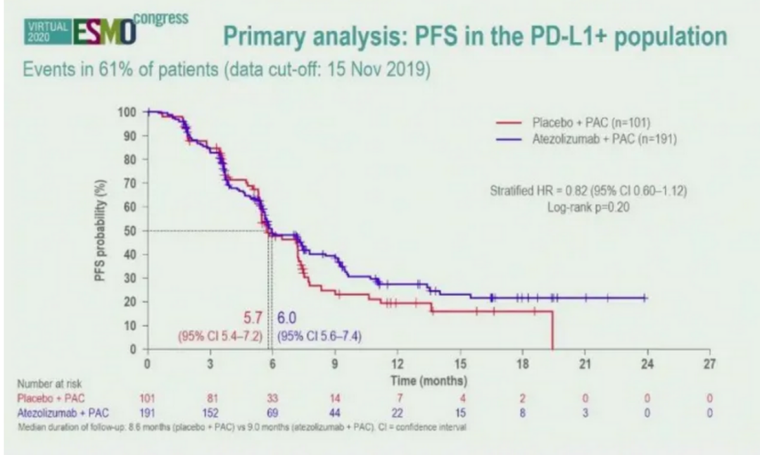 同样是TNBC一线免疫治疗,IMpassion131研究却没有得到很好的结果。IMpassion131研究是为了明确atezolizumab能否联合临床上更常用的溶剂型紫杉醇而进行设计的临床试验。令人遗憾的是,2020年ESMO会议上公布的IMpassion131研究未能显著改善主要研究终点PFS。
