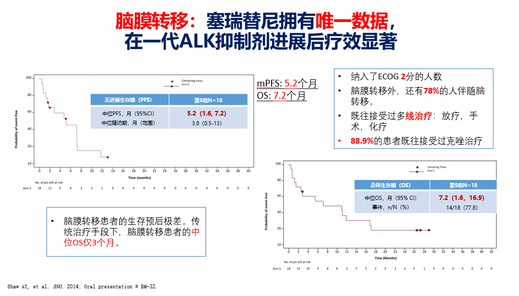个人临床经验中,ALK阳性有症状、进展期脑转移患者约占30%。对于无症状脑转移,可尝试先用靶向药物,若在此基础上仍控制不佳,可加用放疗。脑膜转移预后凶险,生存期仅2-3个月,可尝试全脑放疗。