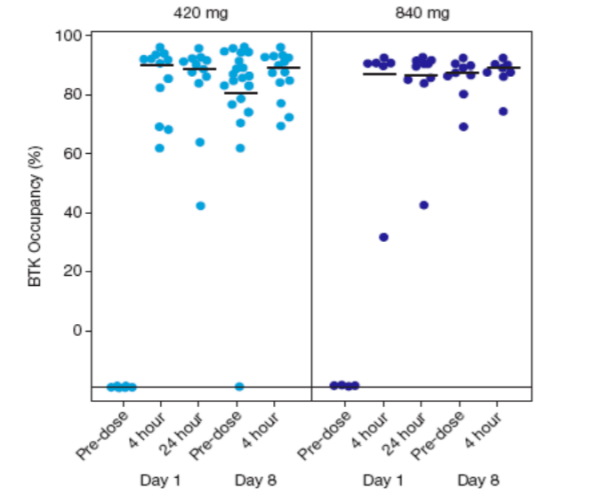 全球第二个上市的BTK抑制剂是阿卡替尼,获批剂量为100mg 每日两次(BID)。阿卡替尼治疗CLL患者的一项2期临床试验,对48例复发/难治或高危初治的CLL患者进行了PBMC的BTK占有率检测,并评估了阿卡替尼100mg每日两次(BID)或200mg每日一次(QD)治疗CLL的安全性、疗效和药效学,研究结果显示,BID组和QD组给药后4小时外周血单核细胞的BTK占有率分别为95.3%和87.6%,P<0.0001,ORR分别是95.8%和79.2%,2年PFS率分别为91.5%和87.2%【3】,表明与QD组相比,BID组的BTK占有率更高,对相关通路的抑制性更强,疗效更佳。该研究侧面反映BTK靶点占有率越高,BTK抑制剂的疗效可能越好。