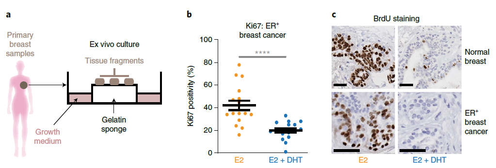 来源于乳腺癌患者的外植体(patient-derived explant, PDE)模型研究初步探究雄激素在乳腺癌细胞增殖中的作用。结果显示雌二醇(E2)单独处理的ER+PDE的Ki-67指数明显高于E2+双氢睾酮(DHT)治疗组。在BrdU检测正常和乳腺癌细胞增殖时,E2和细胞周期调节的基因呈正相关而联合DHT则呈负相关,提供了雄激素在E2暴露的临床乳腺组织中抗增殖作用的直接证据。