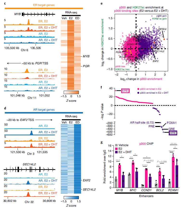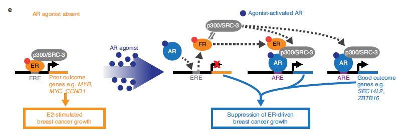AR激活后丢失的ERBS包括已建立的ER靶基因相关的位点(如PGR、MYB、BCL2),获得的ERBS包括与ER+乳腺癌细胞中AR信号调节基因相关的位点(如SEC14L2、EAF2、ZBTB16)。值得注意的是,AR激活可以引起E2刺激的p300酶结合位点的重新分布,而p300是H3K27在转录活性增强子上进行H3K27乙酰化所必需的限速因子,因此,AR介导的p300在与ER调节的细胞周期基因相关的转录活性增强子处的位移是抑制ER刺激增殖性转录组的一种重要手段。ER招募p300需要协同SRC-3调节蛋白,而由于AR不需要SRC-3来招募p300,因此在招募这种关键的共激活剂方面,AR比ER更具备竞争优势。