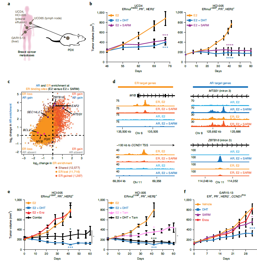 接下来,为了测试AR激动剂在内分泌耐药的ER+乳腺癌患者中的疗效,采用了来源于乳腺癌患者的异种移植(patient-derived xenograft, PDX)模型,该模型来源于四名接受一种或多种内分泌治疗后出现疾病进展的患者的转移瘤。与上述ZR-75-1异种移植数据一致,AR激动剂能够显著降低肿瘤增殖指数,并在全基因组范围内潜在降低ER染色质结合,包括细胞周期基因位点。这些具有临床相关性的体内模型系统的治疗研究为晚期ER+乳腺癌的多种情况下的AR激动剂治疗策略提供了强有力的支持。