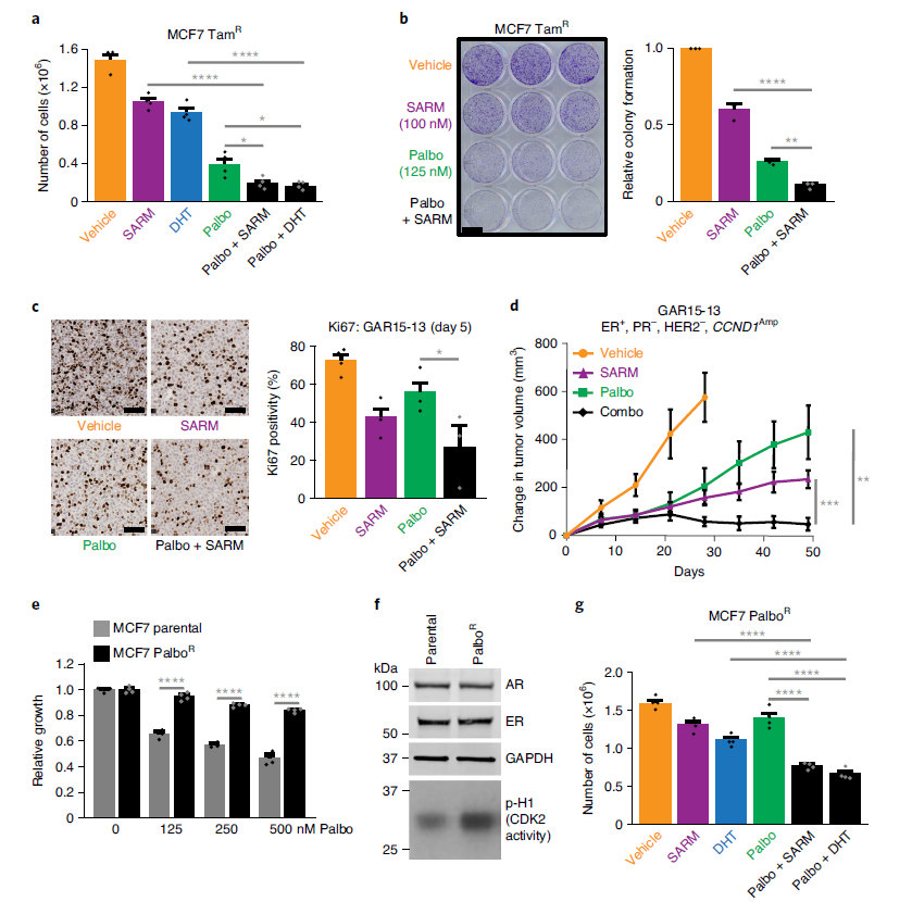 此外,考虑到细胞周期蛋白依赖性激酶4/6抑制剂(CDK4/6)联合内分泌治疗目前已成为成为晚期乳腺癌妇女的标准治疗,作者将AR激动剂与CDK4/6抑制剂联合使用。结果显示,相对于对照组而言,CDK4/6抑制剂联合AR激动剂生长抑制效果增强。