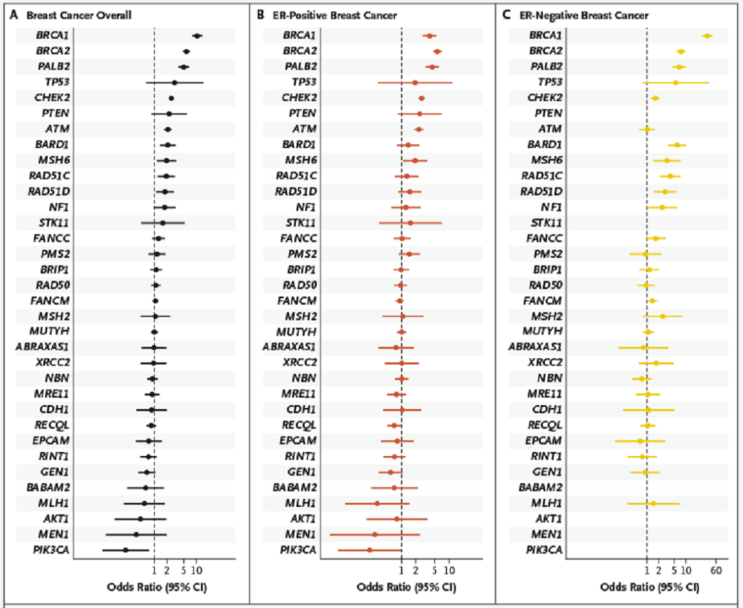 BARD1、RAD51C、RAD51D致病性变体与ER阴性乳腺癌和三阴性乳腺癌(TNBC)的风险增加相关,而ATM、CDH1、CHEK2致病性变体与ER阳性乳腺癌的风险增加相关。
