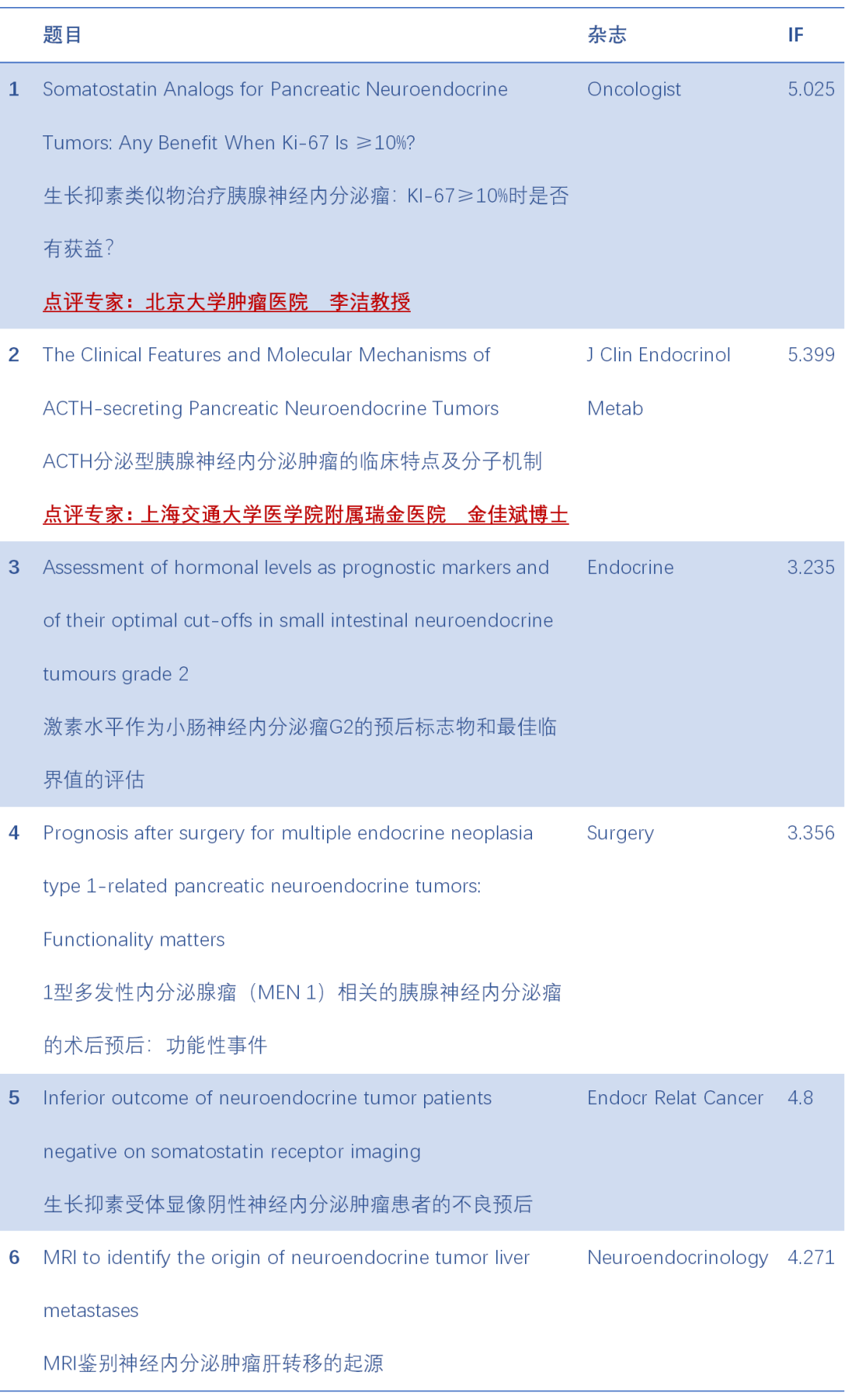 编者按:第20期“诺华NET之声”,为读者精选了神经内分泌肿瘤(NET)领域新近发表的6项研究,涵盖生长抑素类似物治疗Ki 67 ≥10% 胰腺NET的研究,由上海市内分泌代谢病临床医学中心和瑞金医院胰腺疾病临床中心发表的ACTH分泌型胰腺NET的临床和分子特征的研究,还有1型多发性内分泌腺瘤(MEN 1)相关胰腺NET的预后,生长抑素受体显像阴性NET的预后、MRI鉴别神经内分泌肿瘤肝转移的起源等研究。本期栏目还特邀北京大学肿瘤医院李洁教授和上海交通大学医学院附属瑞金医院金佳斌教授分别对前两项研究进行点评。