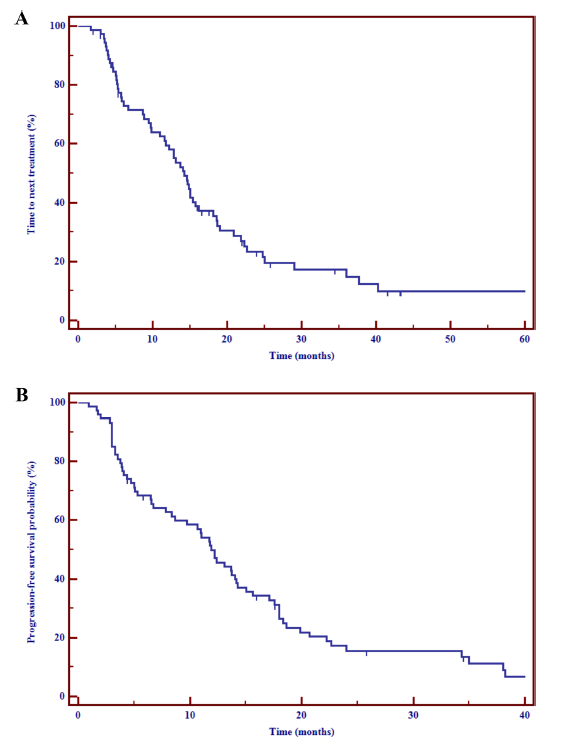 图1. Kaplan-Meier生存分析:(A) 至下次治疗时间,(B)无进展生存期