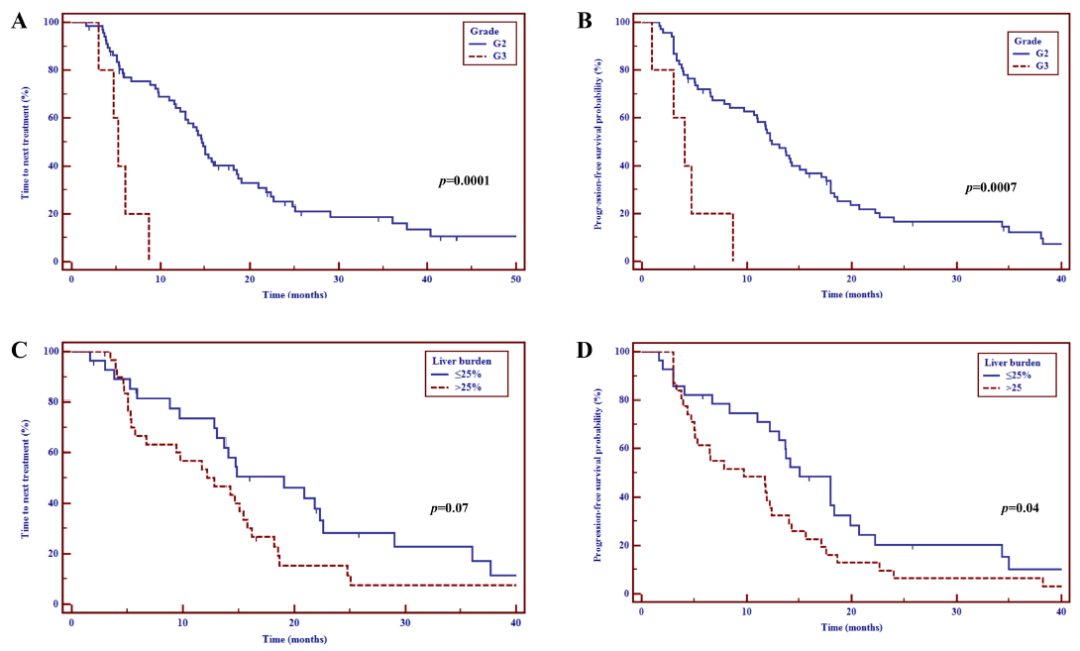 图2. Kaplan-Meier生存分析:肿瘤分级(A-B)和肝肿瘤负荷(C-D)对TNT和PFS的影响