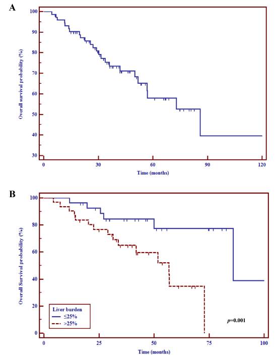 图3. 总生存期Kaplan-Meier生存分析: (A)总人群,(B)肝脏肿瘤负荷≤25% vs >25