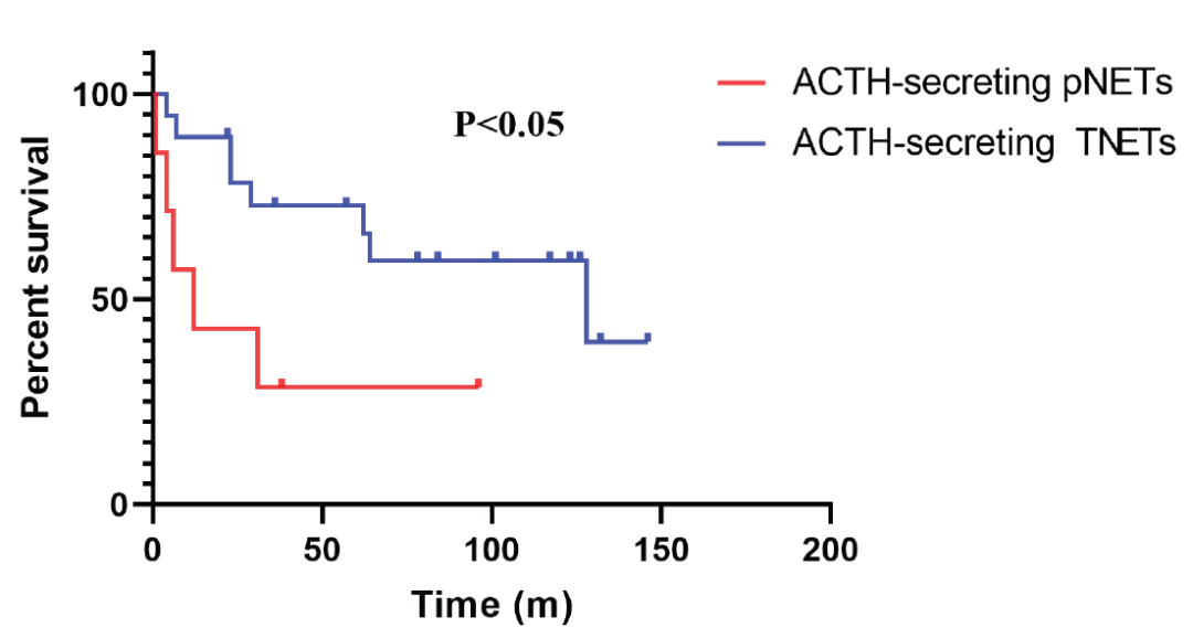 注:pNETs和TNETs的1年生存率分别为42.9%和89.5%;5年生存率分别为28.6%和72.7%图4. 总生存曲线:ACTH分泌型pNET vs ACTH分泌型TNET