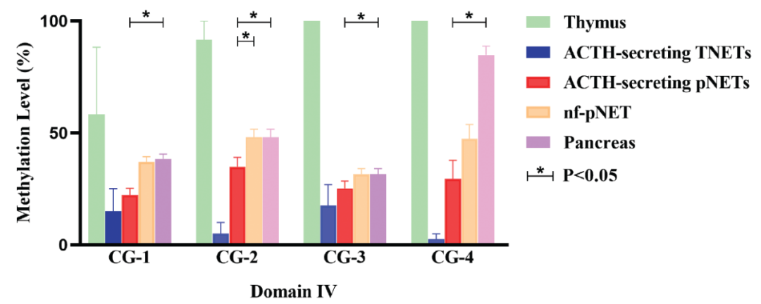 图5. ACTH分泌型TNETs、ACTH分泌型pNETs、nf-pNETs和胰腺中POMC启动子区Ⅳ区甲基化