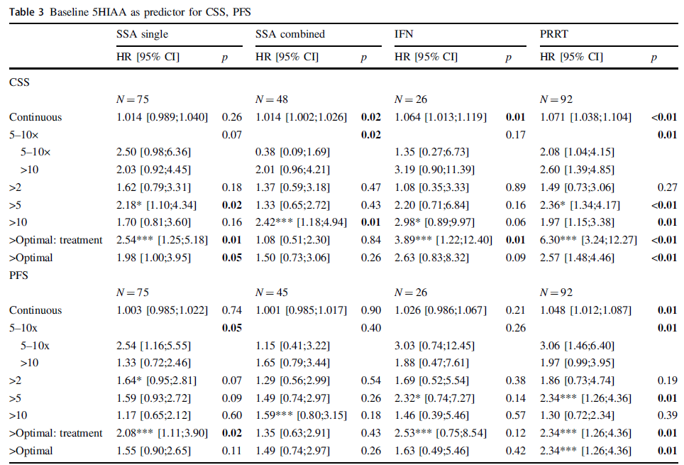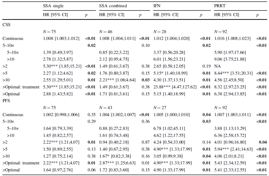 综上,无论接受何种治疗,基线CgA和5-HIAA均与CSS相关,与PRRT后的PFS相关,5×ULN在许多但并非全部情况中可以最好区分。CgA和5-HIAA的早期降低是SSA治疗的预后指标,但不是PRRT的预后指标。