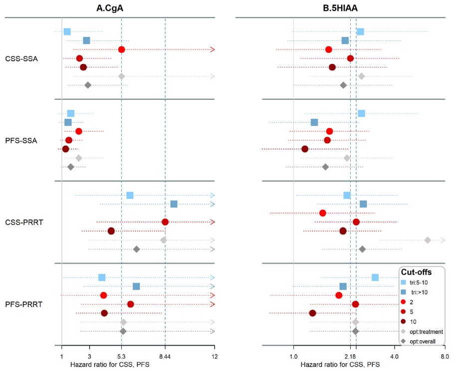 图6. 接受生长抑素类似物(SSA)或肽受体放射性核素治疗(PRRT)的不同临界值患者的肿瘤特异性生存期(CSS)和无进展生存期(PFS)。A. 嗜铬粒蛋白A(CgA);B. 5-羟基吲哚乙酸(5-HIAA)