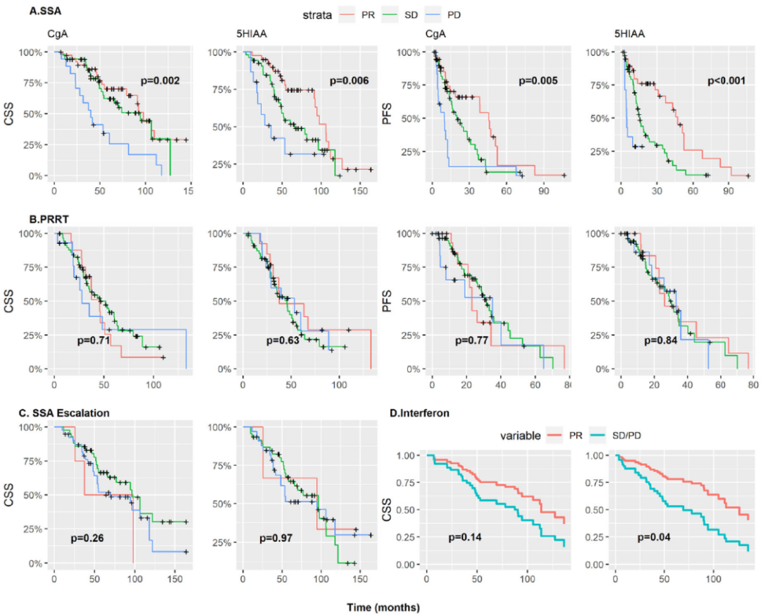 图7. 根据6个月生化缓解分层的生长抑素类似物(SSA) (A)、肽受体放射性核素治疗(PRRT) (B)和SSA剂量递增(C)治疗的肿瘤特异性生存期(CSS)和无进展生存期(PFS)。干扰素治疗患者调整后的CSS生存曲线,根据cox模型的生化缓解,根据伴用SSA治疗分层(D)
