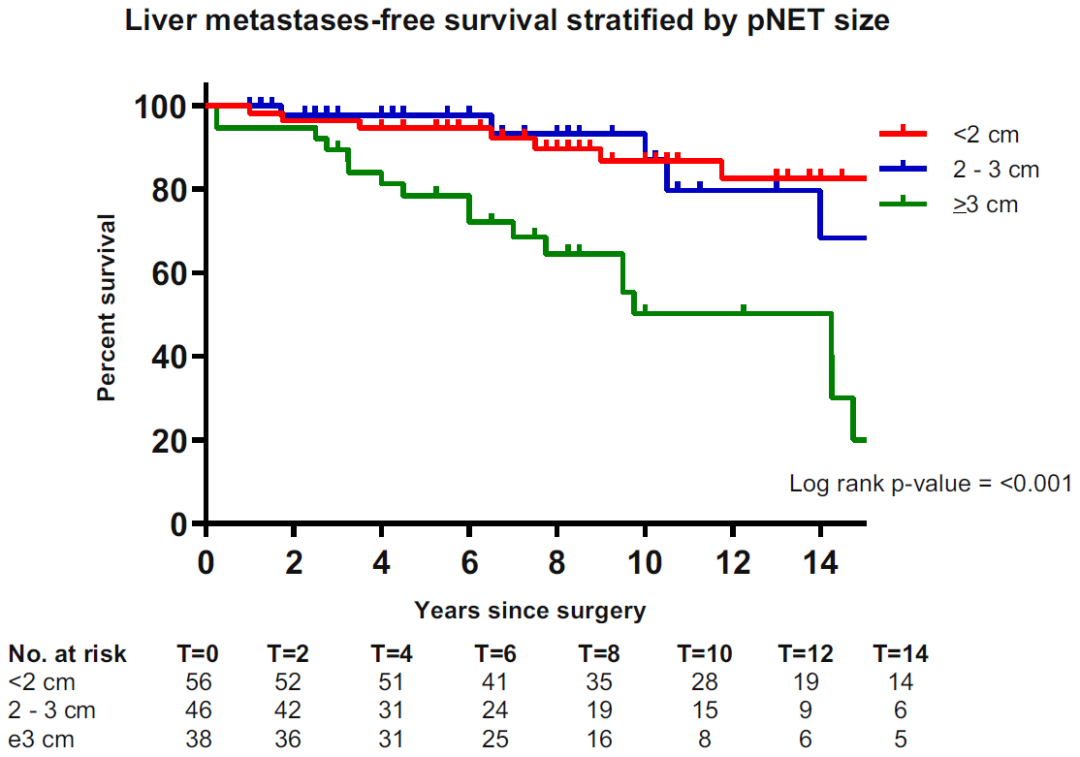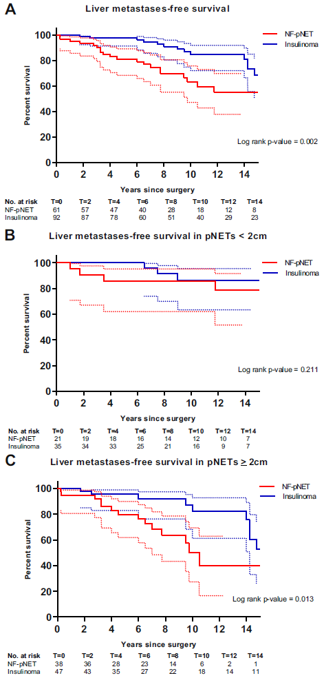 研究从两个数据库(DutchMEN Study Group和International MEN1 Insulinoma Study Group数据库)纳入1990年至2016年之间进行MEN 1相关的非功能性胰腺神经内分泌瘤切除的患者。通过Cox回归分析以评价非功能性胰腺神经内分泌瘤患者对比胰岛素瘤患者的无肝转移生存期,并确定与无肝转移生存期相关的因素。