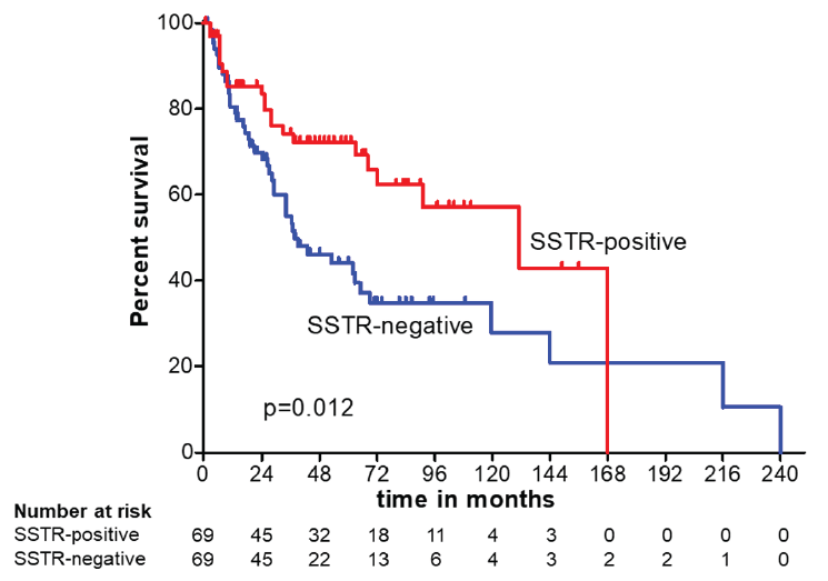 SSTR阴性定义为诊断性SSTR显像中肿瘤摄取不足。排除接受PRRT的患者。研究纳入77例SSTR阴性和248例SSTR阳性的G1-2 NET患者。SSTR阴性患者的中位总生存期显著低于SSTR阳性患者(53个月vs 131个月;P<0.001)。为了校正年龄、性别、肿瘤级别和原发部位可能造成的混淆,将69例SSTR阴性NET患者与69例SSTR阳性NET患者进行倾向性评分匹配。除了SSTR阴性的患者更常接受化疗和靶向治疗外,其他特征相似。
