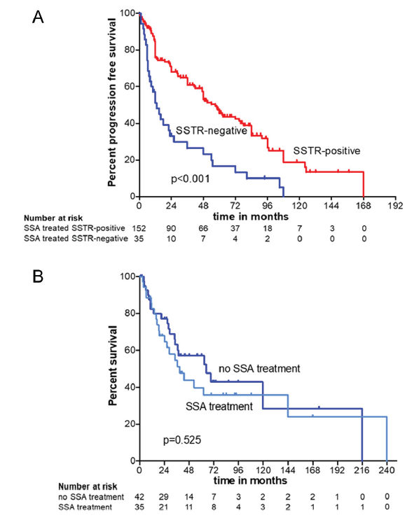 A. 不同SSTR状态患者接受SSA后的无进展生存期;B. SSTR阴性患者的总生存期(SSA vs 无SSA)