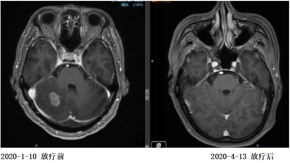 2020年1月患者出现头痛症状,复查脑MR示:枕叶及右侧小脑半球多发结节,结合病史考虑转移灶。