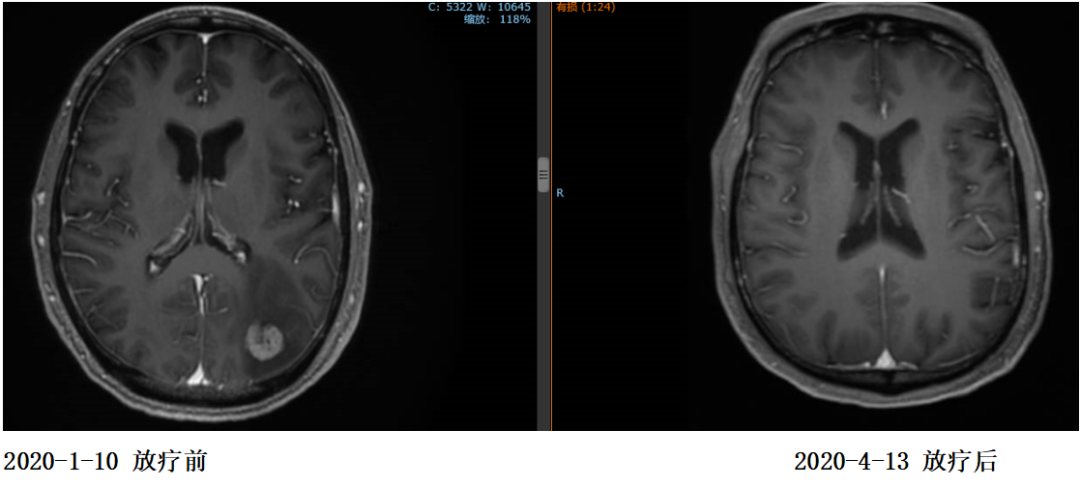2020年1月13日开始对左侧枕叶及右侧小脑转移灶进行放疗,PTV-GTV=44.5Gy/9F